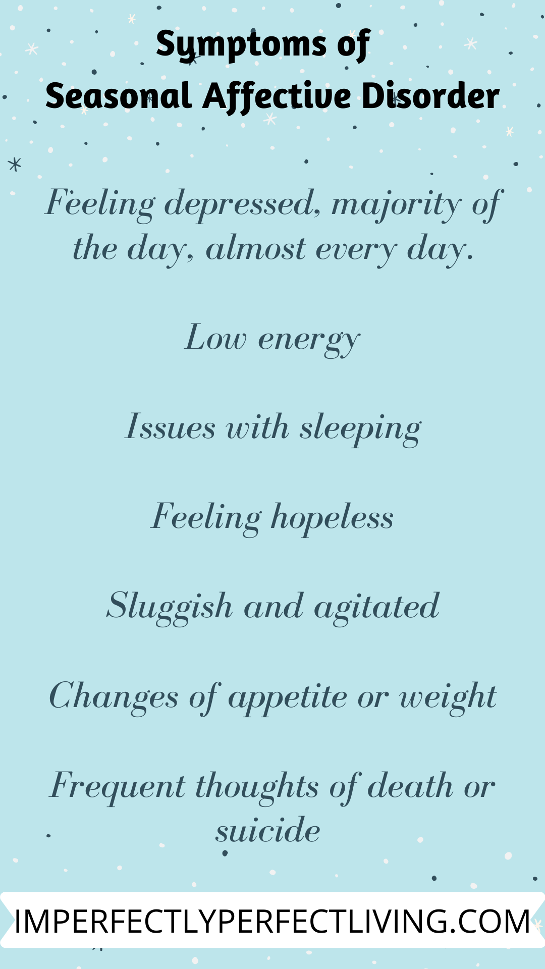 Many times you may just be experiencing the “winter blues”. This is when the dreary weather and the lack of sunlight just make for a gloomy day. If you have these symptoms you may actually have seasonal affective disorder, but be sure to speak with a mental health professional to be sure and get proper treatment.